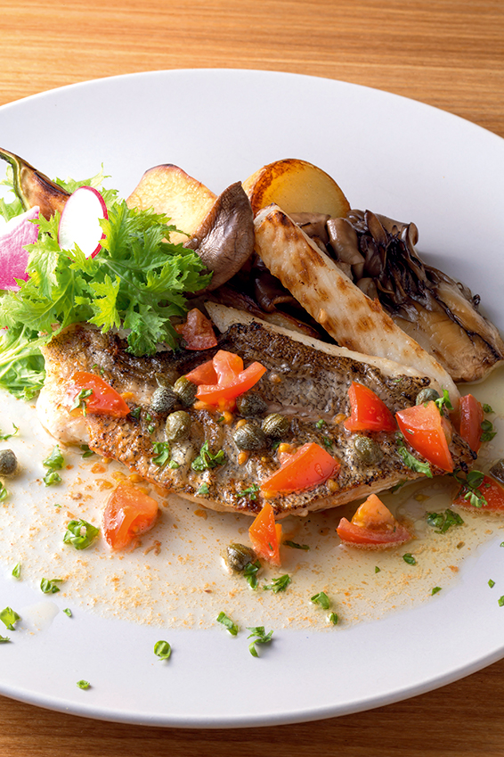 皮はパリッと身をふわっと蒸し上げた季節の鮮魚に、ケッパーとフレッ シュトマトのソースを合わせた「本日の鮮魚料理」(1760円)。
