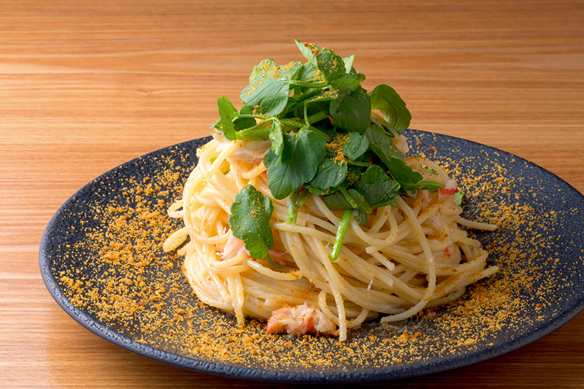 せりの爽やかな苦みがアクセントの「ズワイガニと 仙台芹のカラスミスパゲッティ」(1540円)。
