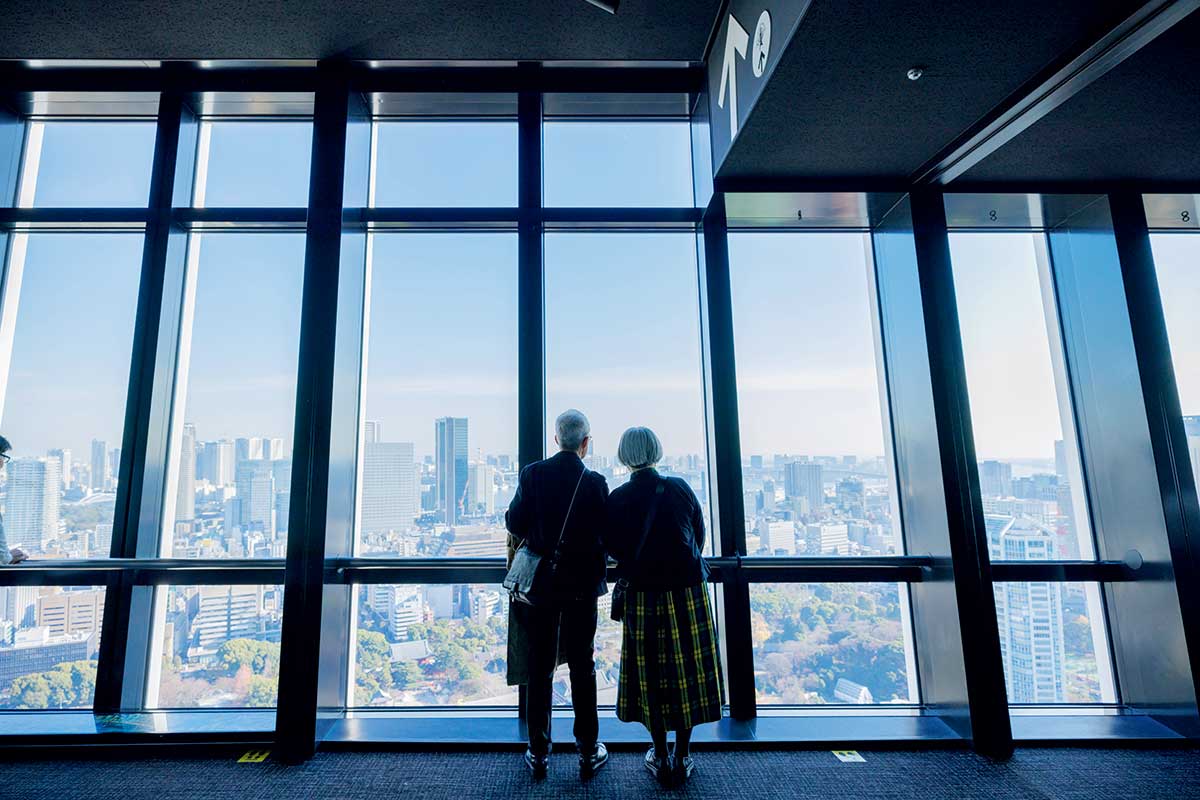 メインデッキから東京の街並みを見下ろす2人。フロアを一周すると、360度の景色が楽しめる。