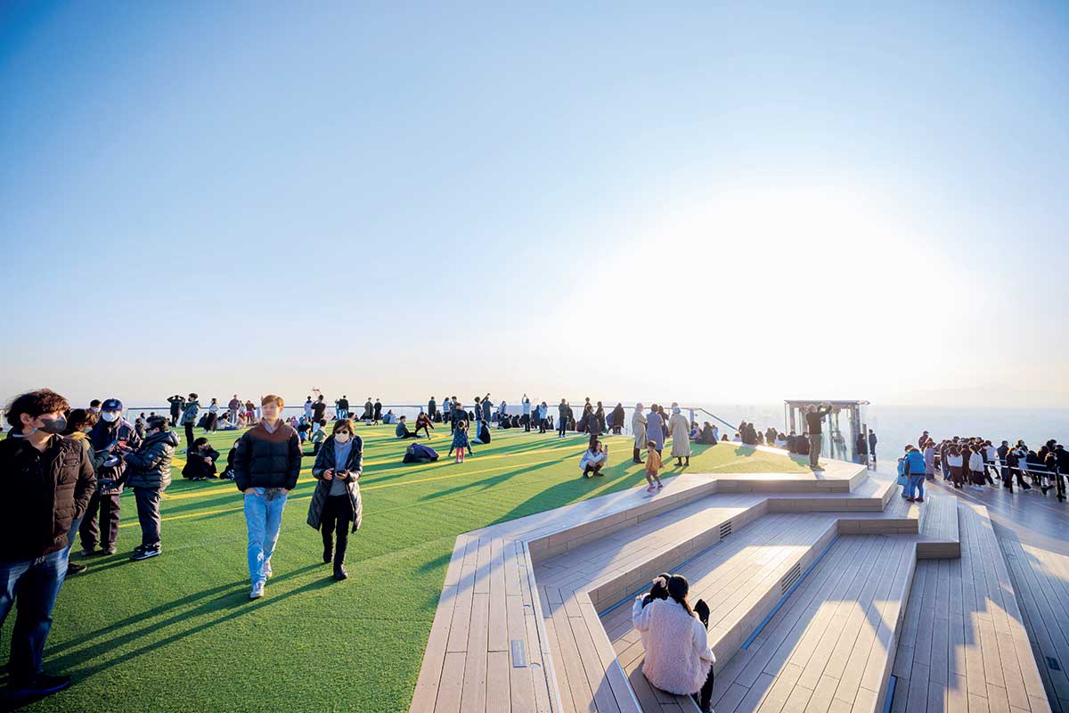 屋上に造られた「SKY STAGE」の一角、スクランブル交差点を望む「SKY EDGE」は、一番人気の絶景スポット。