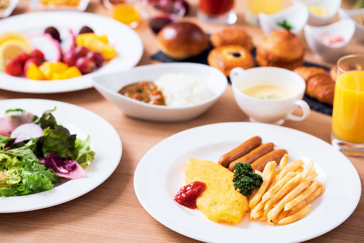自然光が射しこむ1階のレストランで、ビュッフェスタイルの朝食。シェフが目の前で作ってくれるオムレツや、種類豊富な和食・洋食のメニューが並ぶほか、ホテル名物のデニッシュパン「マウンテン」も。「あれもこれもと、食べすぎてしまいますね」と大満足。