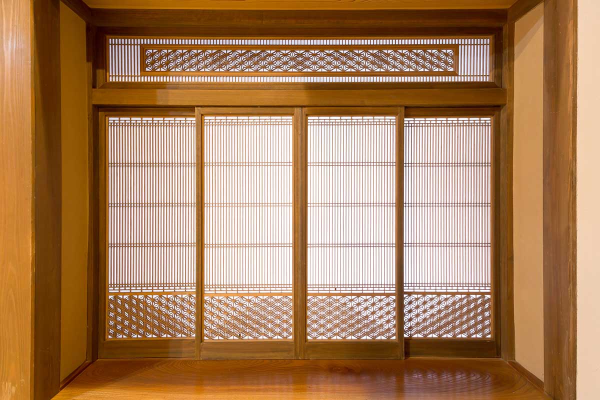 手鞠や富士山が透かし彫りされた建具には、家庭の円満や繁栄など さまざまな想いが込められている。