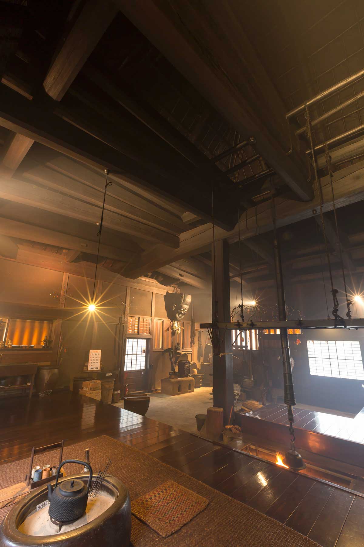 茅葺き屋根を支える太い大黒柱と四段梁の重厚 な造りが特徴的。台所には火の守り神「かまど 神」も再現されている。