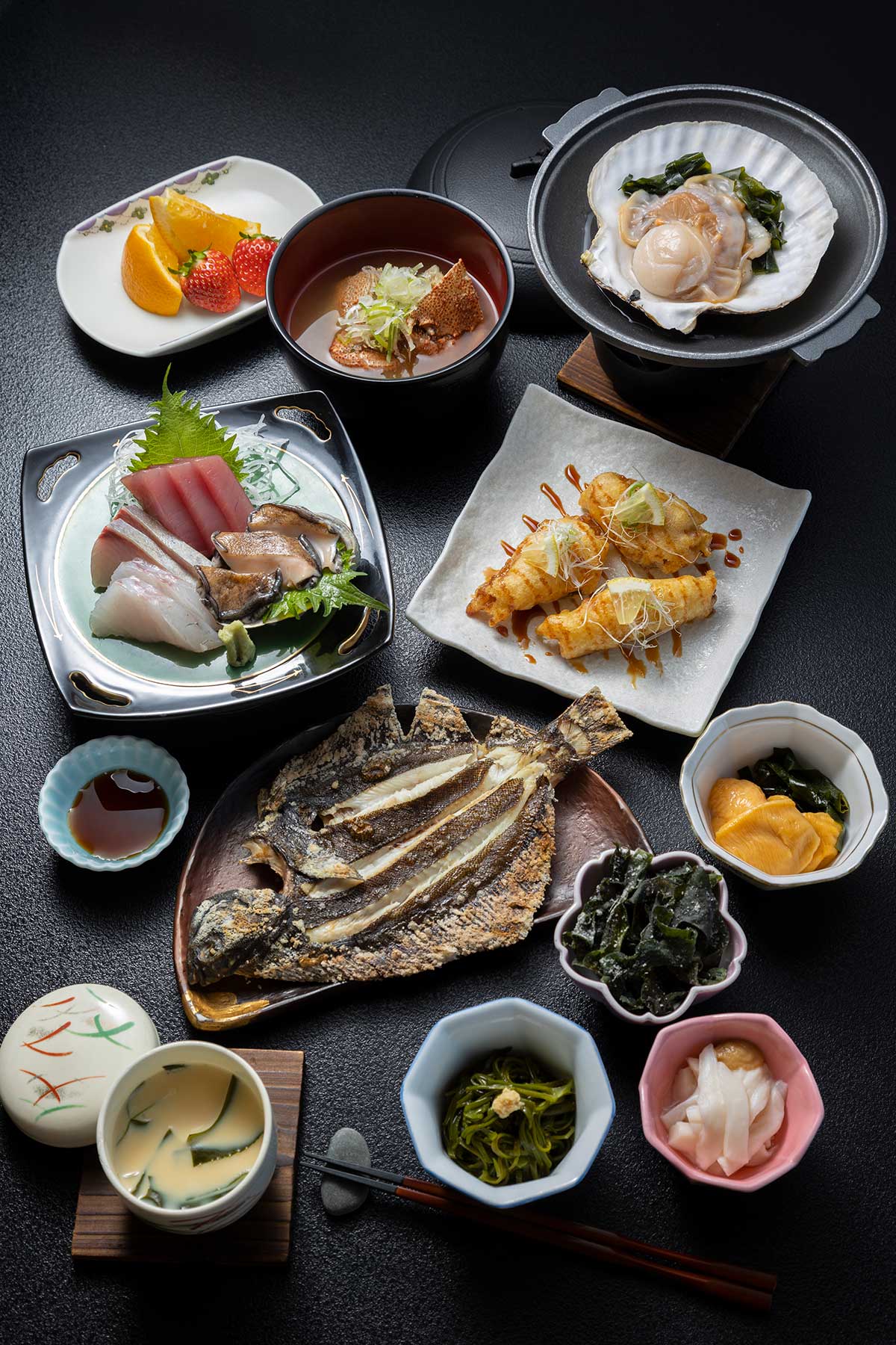 絶景に加えてこの宿のもう一つの売り、それは漁師でもあるオーナーが厳選した三陸の海の幸。基本コースとなる「さざ波コース」では、時季に応じてアワビの踊り焼きかホタテの貝焼き、そして今の季節はマコガレイやタラ、ソイ、ワラサといった三陸産の旬魚を用いた焼き魚、お造り、天ぷら、あら汁などが味わえる。また、宿泊客に振る舞われる名物の「カジキマグロのかぶと煮」も絶品。長時間煮込んだカジキマグロの頭は、味が染み込み、身はほろりと崩れるほどに柔らかだ。3月初旬まではオーナーが養殖した生ワカメのしゃぶしゃぶを朝食で楽しむこともできるのも嬉しい。良漁場である大船渡湾で育ったワカメ特有の、肉厚でシャキシャキとした歯応えと磯の風味を存分に満喫したい。