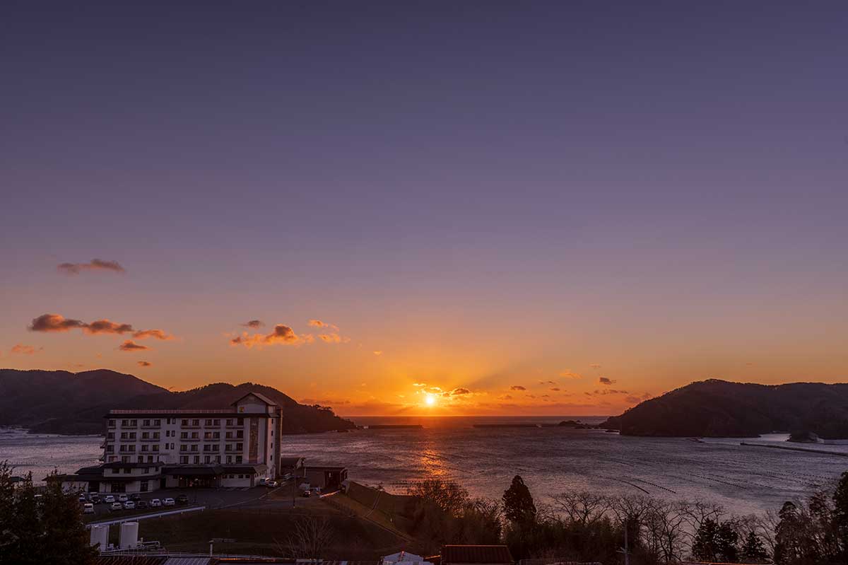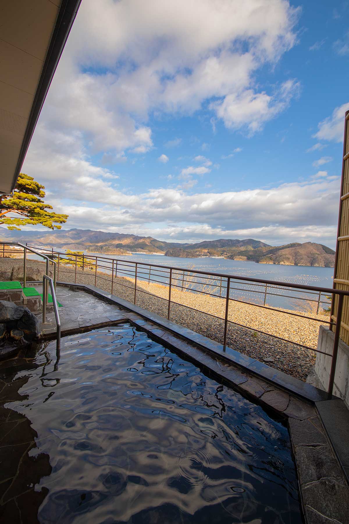 館内に足を踏み入れた瞬間から、絶景のもてなしが始まる。まずロビーでは、壁面いっぱいに設えられたガラス窓の先に波風穏やかな湾の風景が広がり、訪れる人を揚々と出迎えてくれる。客室から刻々と変化する湾を眺めていると、時の経つのも忘れてしまうほど。日常の忙しなさや喧騒から解放され、「無」になれるひとときを過ごすことができる。このエリアで数少ない天然温泉が自慢の宿でもある『大船渡温泉』。露天風呂からももちろんオーシャンビューを享受することができる。暗闇の中に瞬く星やイカ釣り漁船の漁火を眺め、静寂の中に時折聞こえる波の音やウミネコの鳴き声をBGMに、「柔らかい」と評判の湯を心ゆくまで堪能しよう。