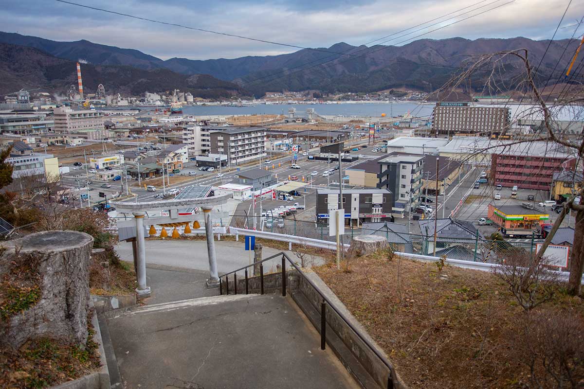 石段を上った高台にある加茂神社からは「キャッセン大船渡」の街並みと大船渡湾を一望できる。