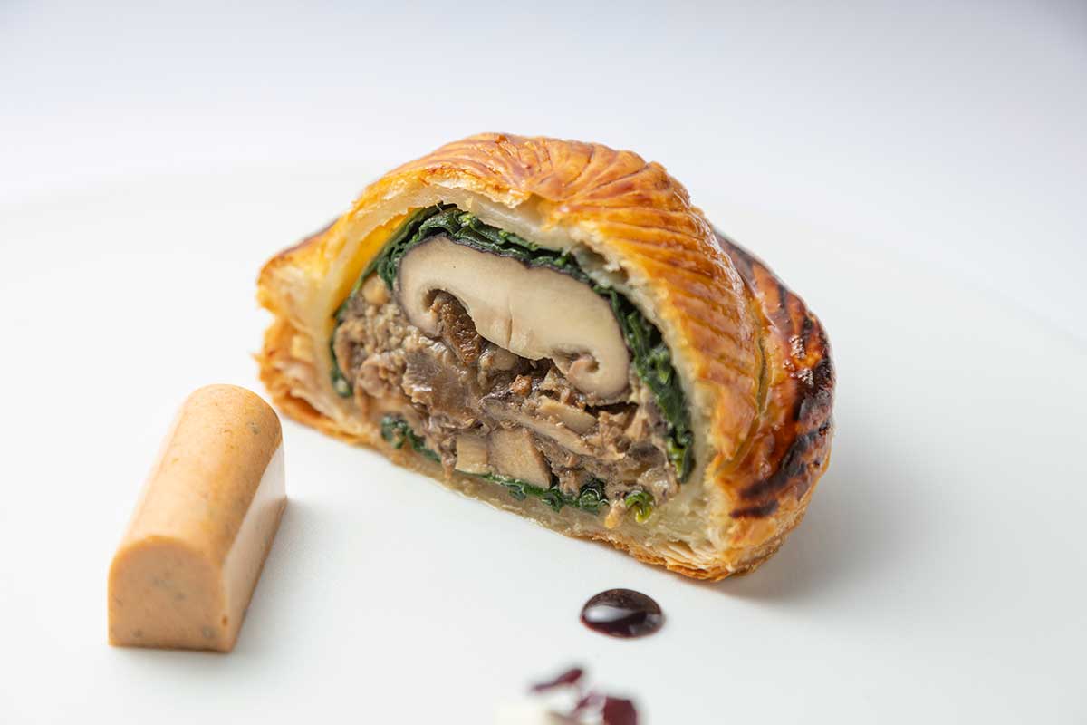 「きのこのパテ・ショー サーモンバターと山ぶどうの ヴィンコット」。岩手県久慈の山ぶどうの原液を赤ワ インとともに煮詰めたソースをあしらった。