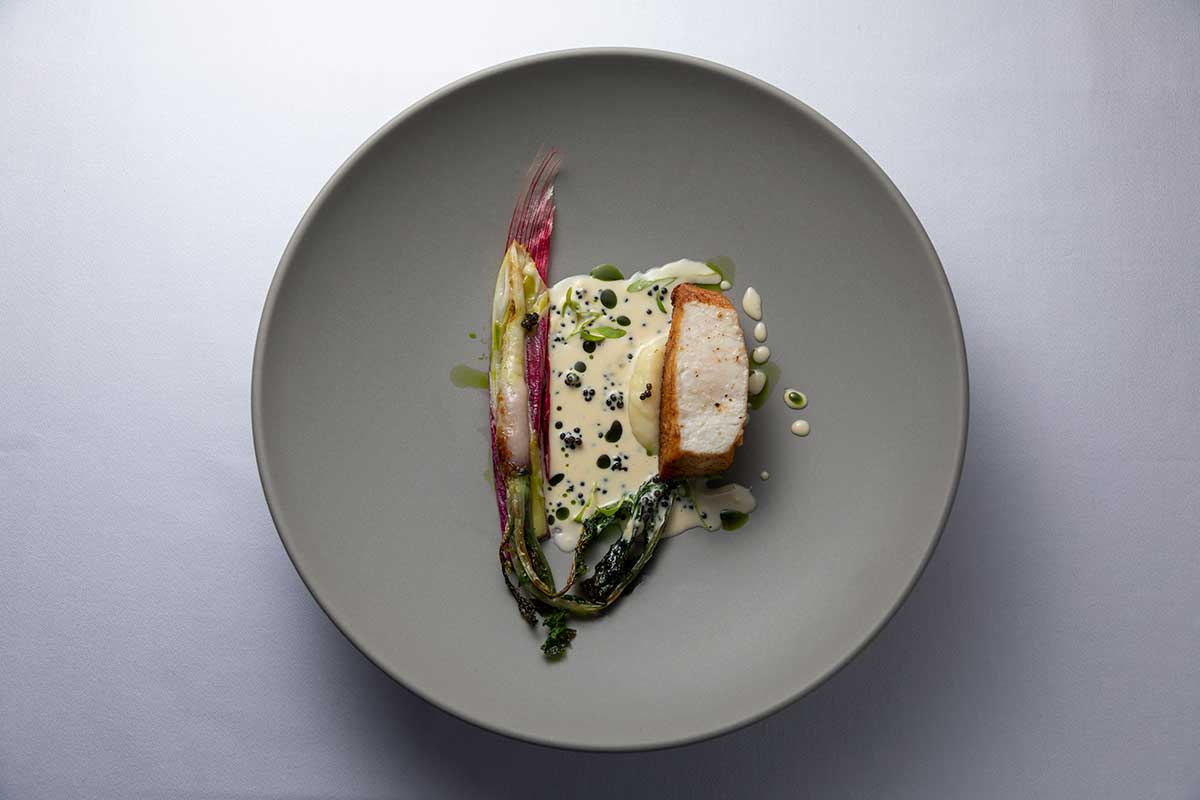 「メカジキのムニエル じゃがいも キャビア」。気仙沼の漁師・前田さんから 直送のメカジキを、じゃがいものピュレとともに。
