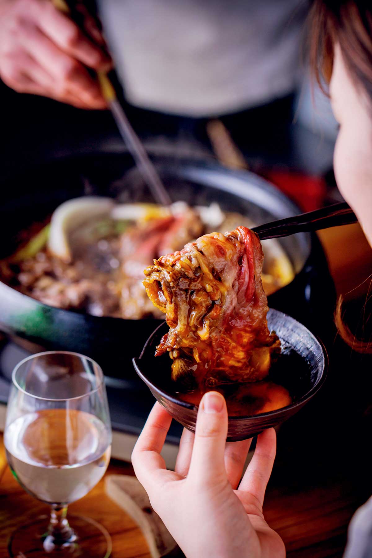 秋田県のマルキク醤油を使ったまろやかな割り下が、肉の旨みを引き立てる。