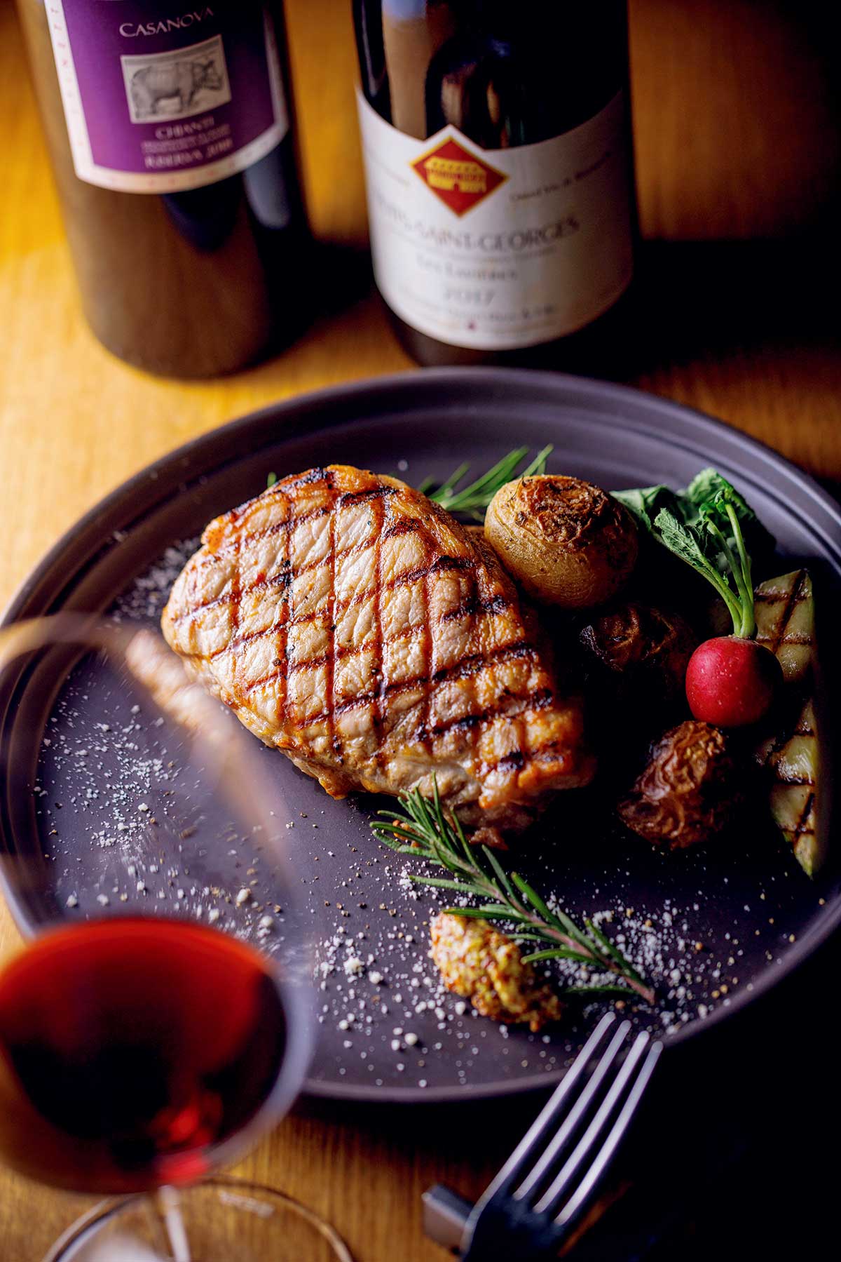 オーナーの出身地である秋田の野菜、北海道から生の状態で仕入れる湧水豚など、素材の良さを生かしたシンプルな料理は、ワインとの相乗効果で味わいが増幅。