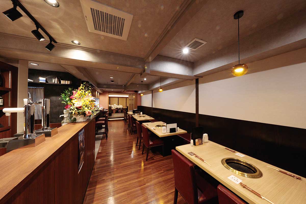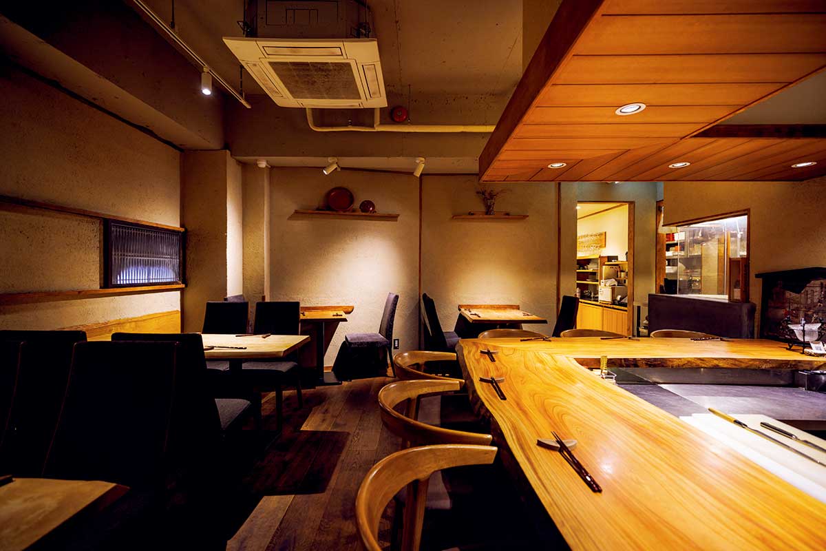 街中の喧騒を忘れさせる落ち着いた店内。カウンターとテーブル席で構成され、上質な肉を気取らず味わえる雰囲気だ。