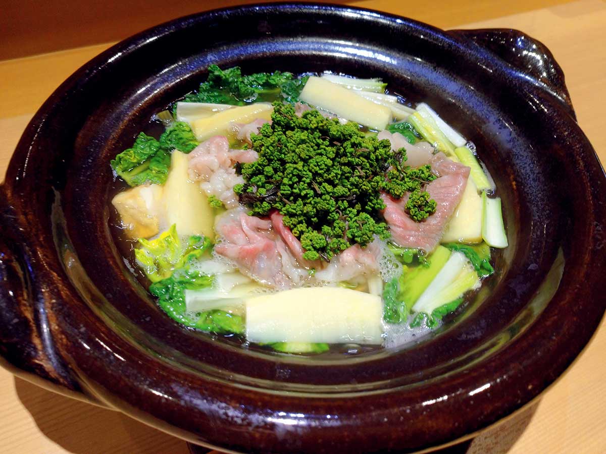 「おまかせ懐石」で楽しめる「花山椒と仙台牛の鍋」(2名~)は季節の限定メニュー。仙台牛や山菜を、爽やかな香りの花山椒と上品な旨みの昆布だしで味わう。