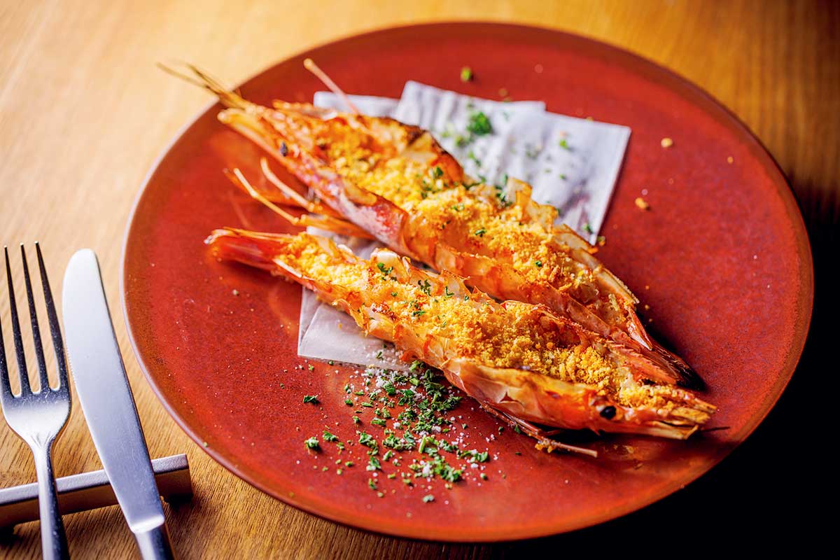 赤エビを丸ごと使用。パン粉に加えたハーブやチーズ、ガーリックオイルの香りが広がる「海老の香草パン粉焼き(2尾)」(1078円)。