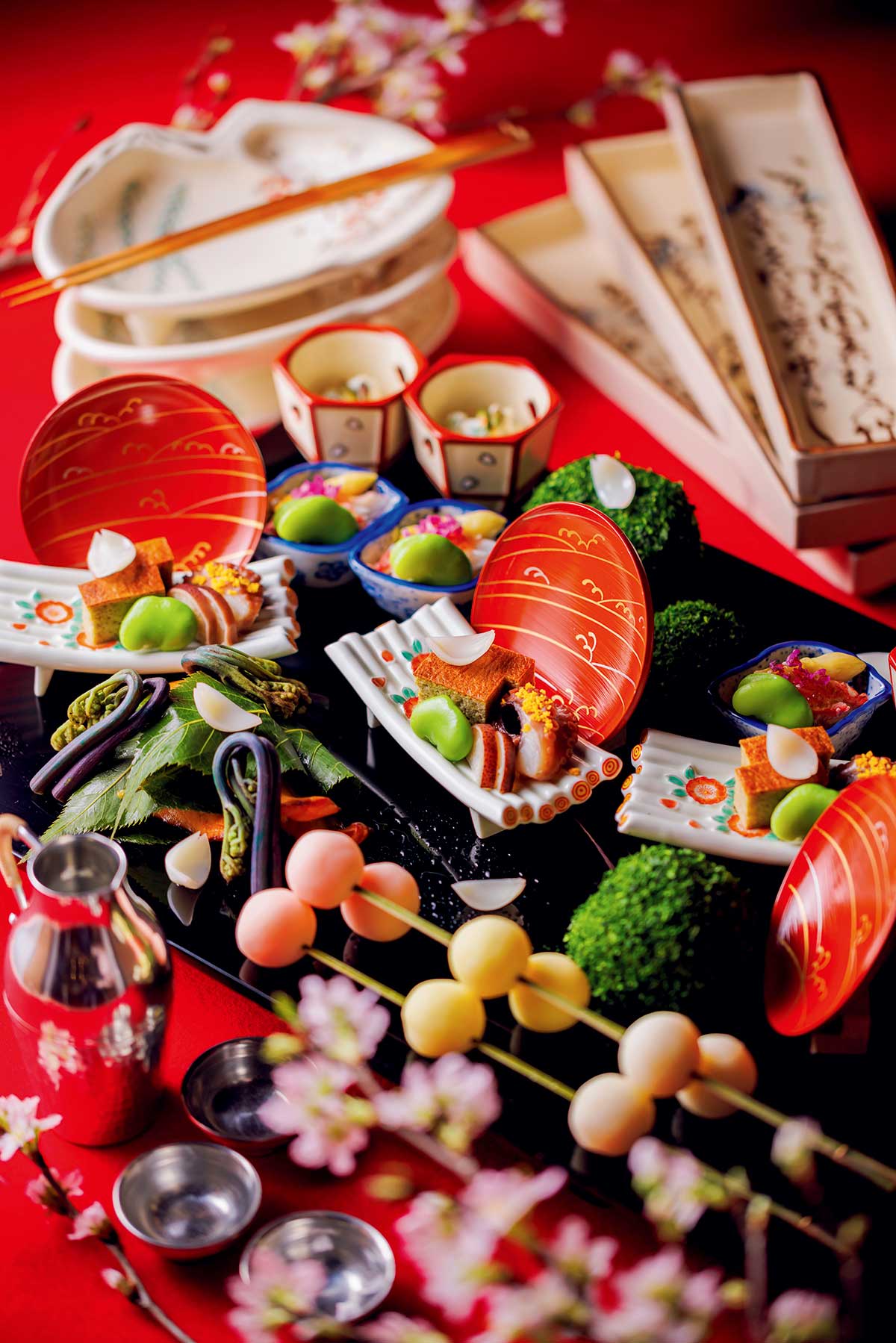 4月は、桜鱒やエンドウ豆、フキノトウなど春の味覚を使い、平安時代の宮中行事「曲水の宴」をテーマに仕立てている。