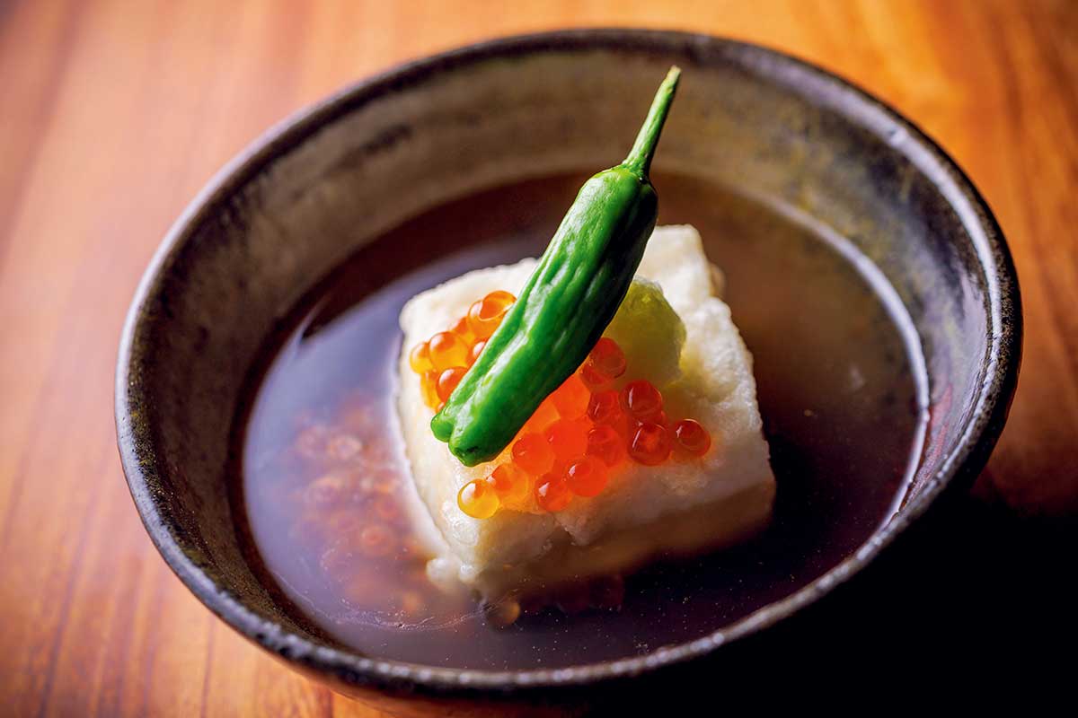 鰹だしで楽しむ「涌谷豆腐の揚げ出し」(880円)は、大豆の風味がしっかりと楽しめる。イクラを添えてワンランク上の仕立てに。