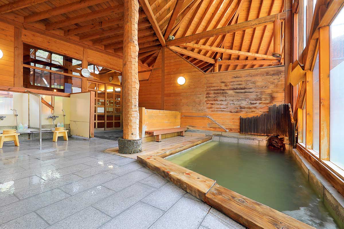 明るい陽射しが差し込み、檜の香りに包まれた浴室が開放感にあふれた、露天風呂付日帰り温泉施設「市太郎の湯」でのんびりくつろげる。