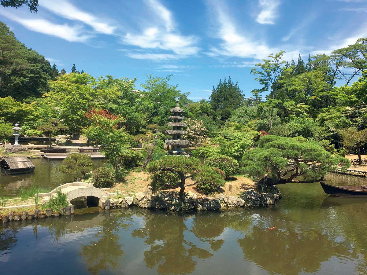 24万平方メートルという広大な敷地を誇る池泉回遊式庭園「小屋館跡庭園」では、百数十本のウメやサクラが咲き誇り、池には錦鯉が泳ぐ。