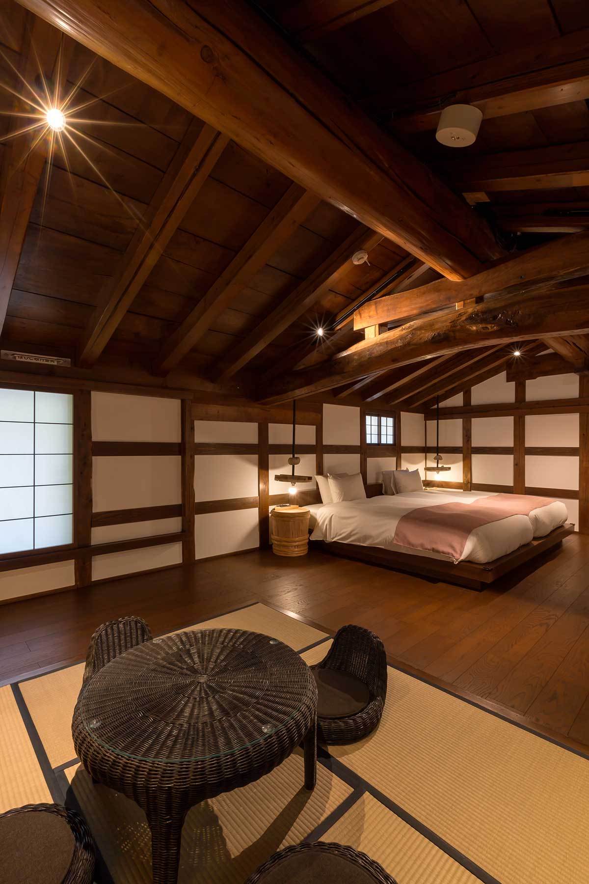 宿へのリノベーションは、できるだけ手をかけないよう意識されており、重厚な梁や棟木なども頭上すぐに見ることができる。