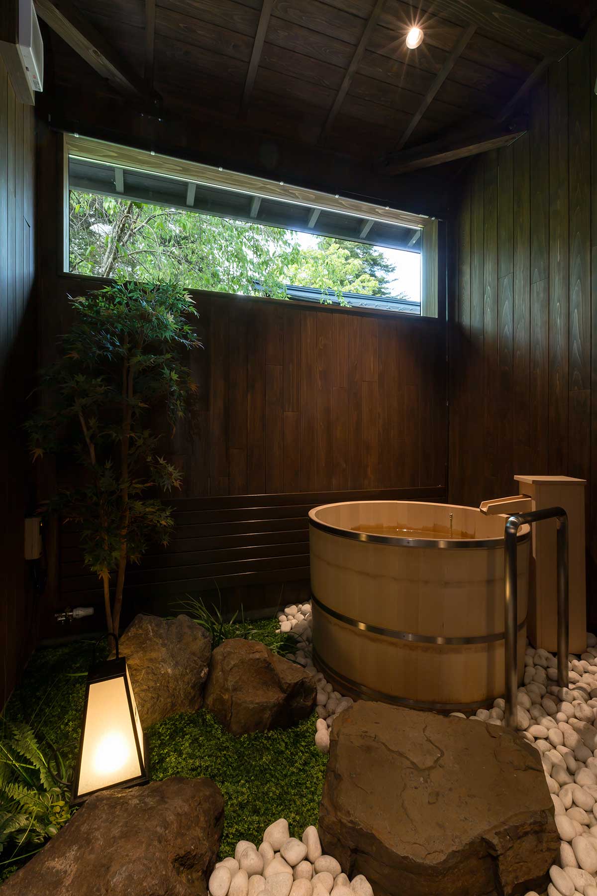 「西宮家ガッコ蔵」の浴槽はテーマに合わせた漬物樽がモチーフ。春は窓の外に角館名物の桜が咲く。