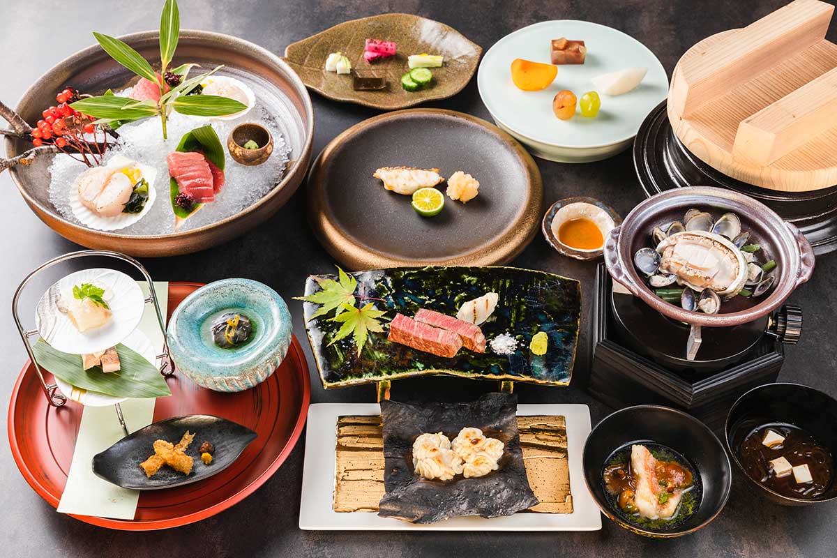 最高級の会席料理が並ぶ離れの夕食。「倉石牛ヒレ ステーキ」や「十三湖産大和蜆と鮑の田酒蒸し」 など贅沢なメニューがずらり。