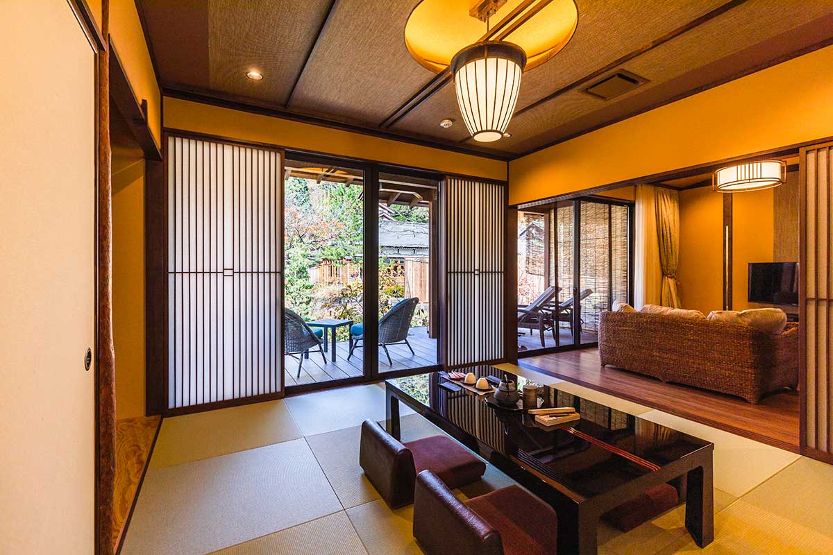 離れ「月寛」のリビング。大きくとられた窓に向かってソファが配置され、窓の外には広々としたデッキテラスもある。