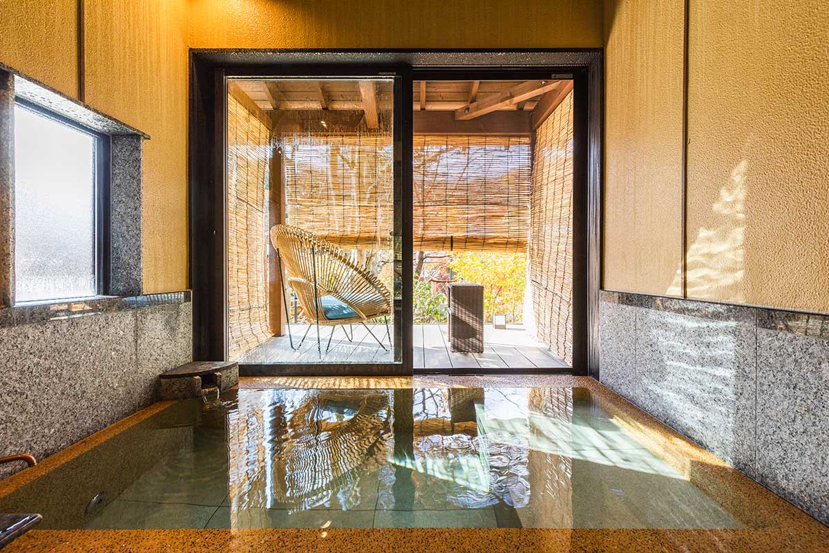 風呂は源泉をそのまま体験できる半露天で、自由気ままに贅沢な空間と時間を堪能できる。