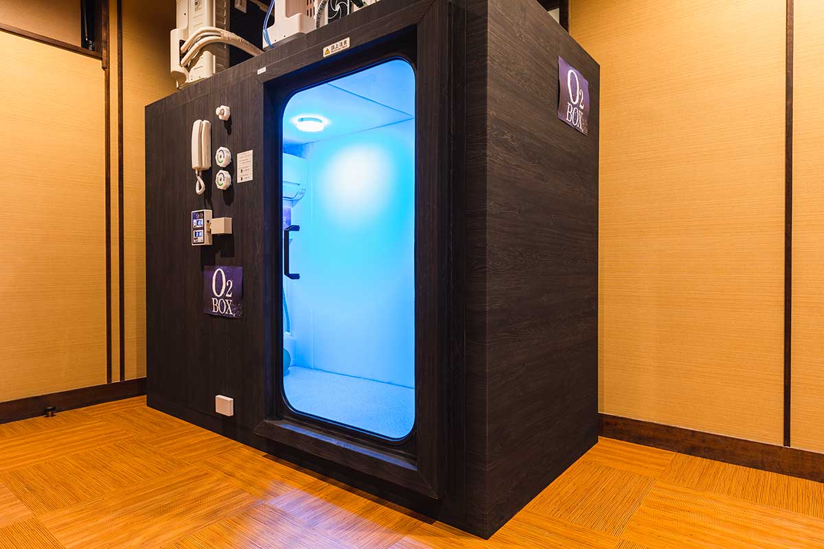 1.1~1.3気圧まで3段階で調節できる「高気 圧酸素ルーム」。カプセルではなくボックス タイプなので、内部で様々な姿勢で寛げる。