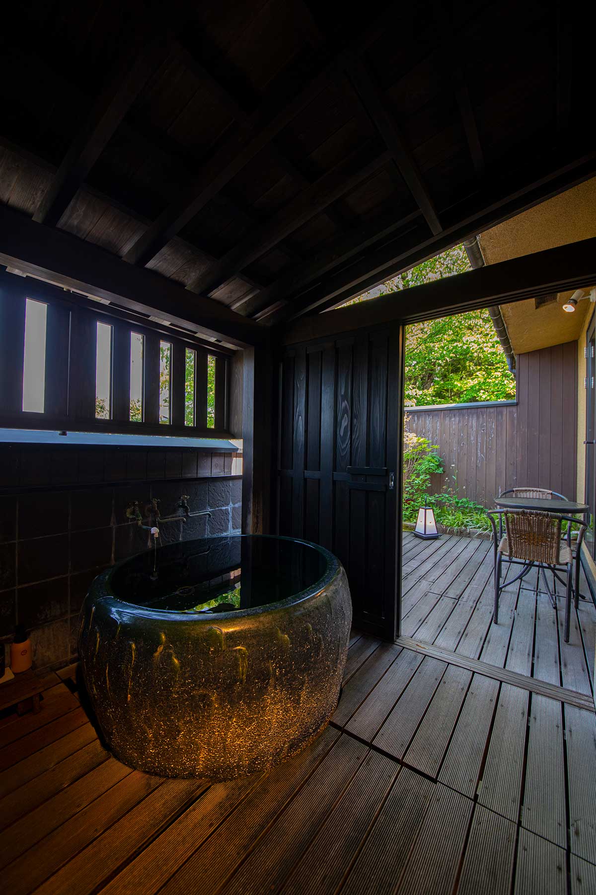 窓辺にもくつろぎのスペースがあり、露天風呂は陶器製。