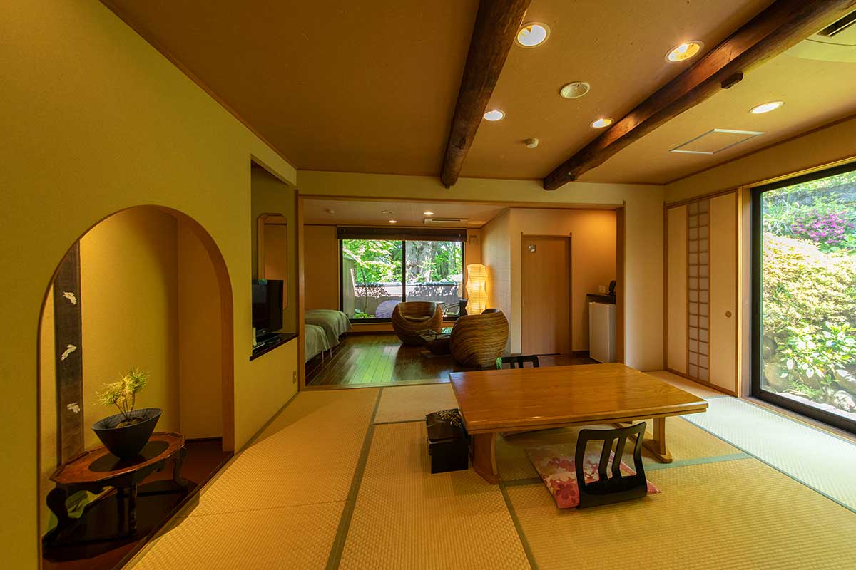 初夏には窓辺の坂庭に咲く紫陽花やツツ ジが美しい「あじさい」。秋には燃える ような紅葉が露天風呂に映るだろう。