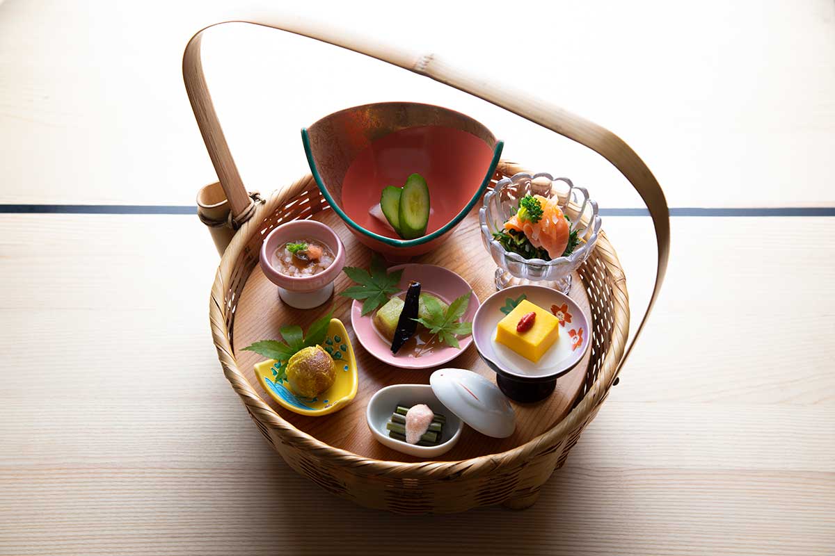 籠盛りの前菜は剥き蕎麦やワラビ真砂、サクラマスのお造り、赤梅甘露煮の黄身衣揚げなど初夏の旬が並んだ。