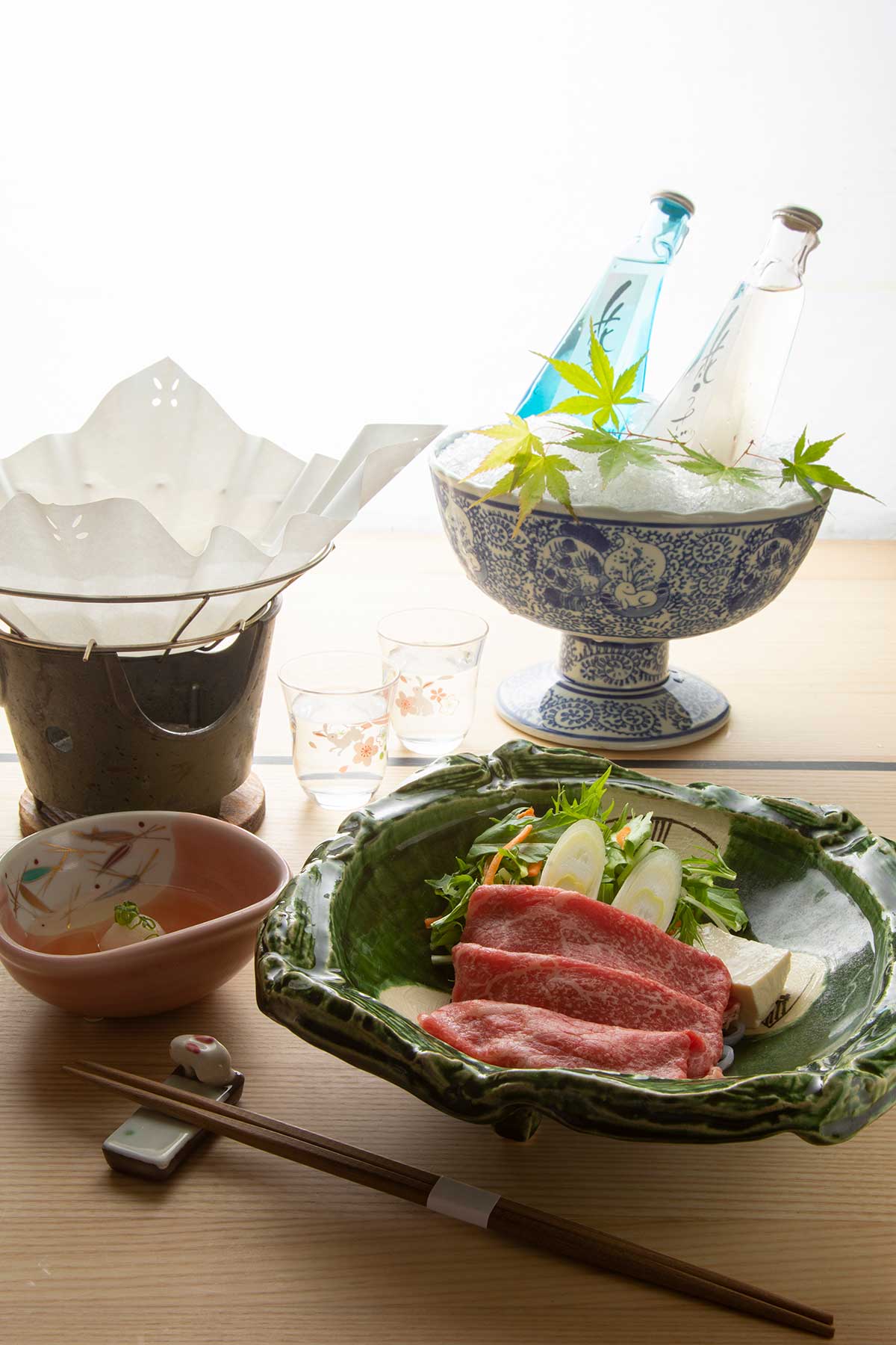 「山形牛のしゃぶしゃぶ」。『橋本屋』オリジナルの冷酒とともに。