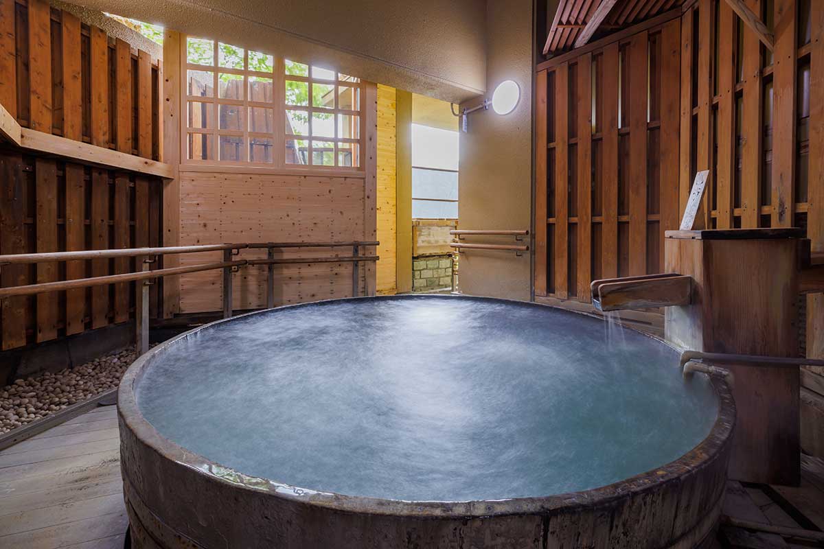 外の新鮮な空気と浴槽の木の香りを感じる高野槇桶露天風呂。