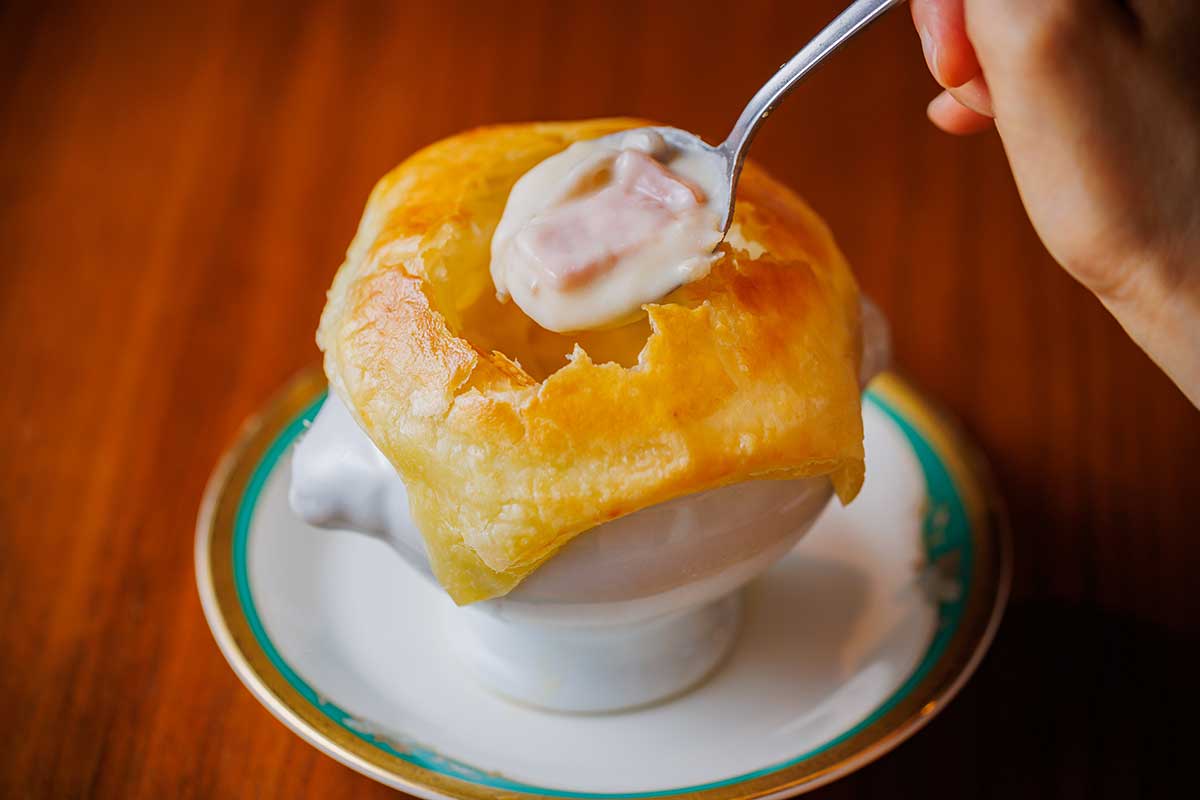 リクエストが多く、2年前に復活した「パイの包み焼き」。パイを崩すと、濃厚なホワイトソースに帆立がたっぷり1個