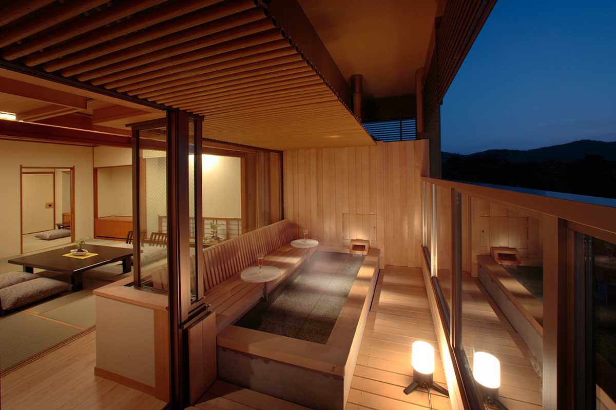 露天足湯が付いた紅葉館の足湯付客室。山々に包まれるようにゆったりとした時間が過ごせます。