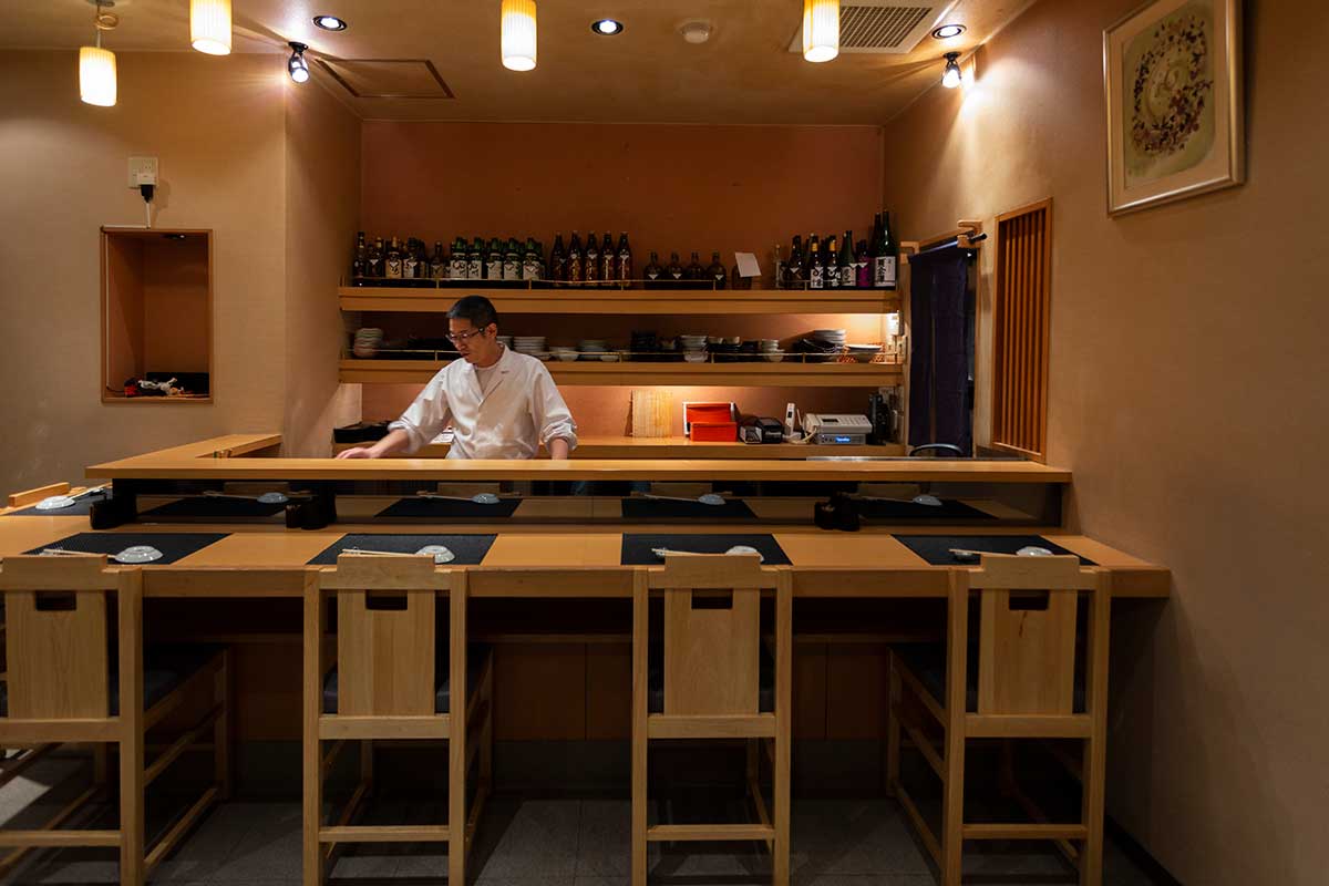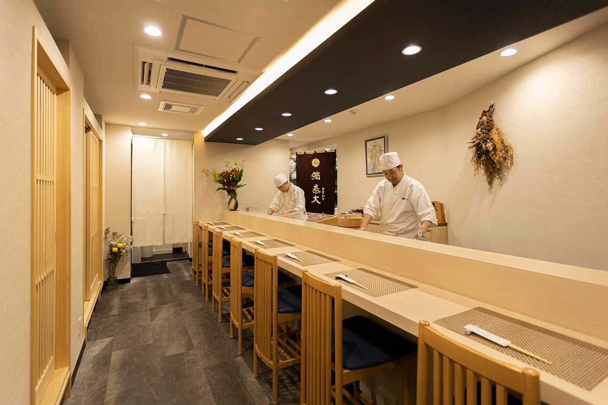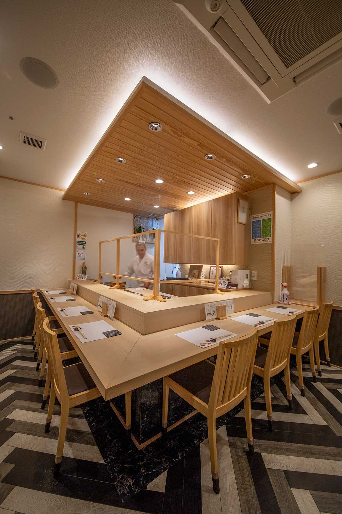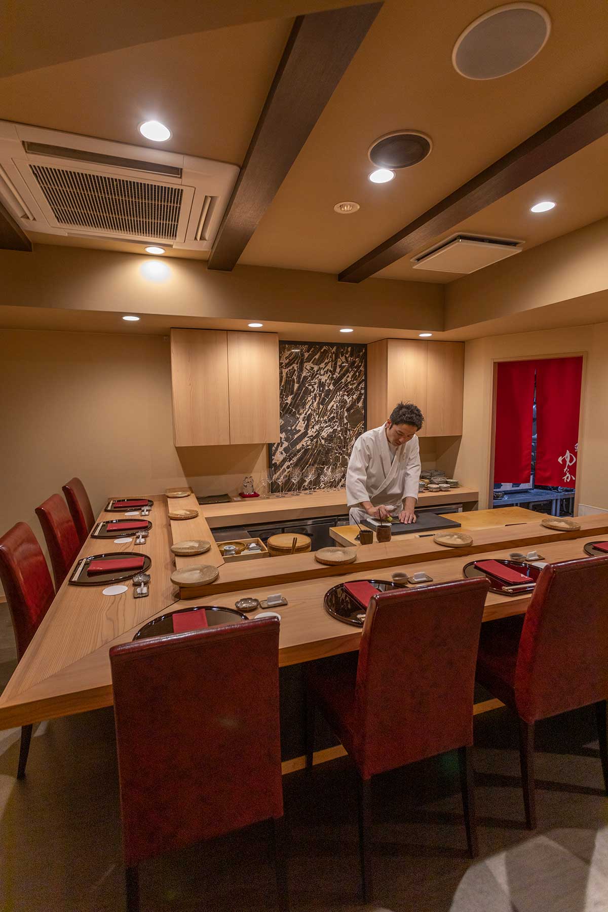 令和4年3月オープン。コの字型に組まれた端正なカウンター。ビルの地下だということを忘れる。