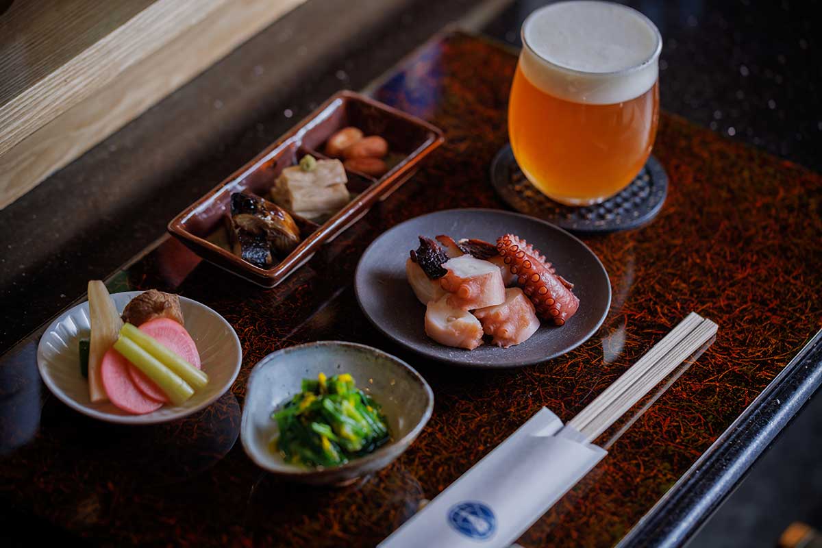 セリと菊のおひたし、自家製漬物、身欠きにしん、くみ上げ湯葉、たこぶつ。この日はクラフトビールの「村上IPA」を合わせて。
