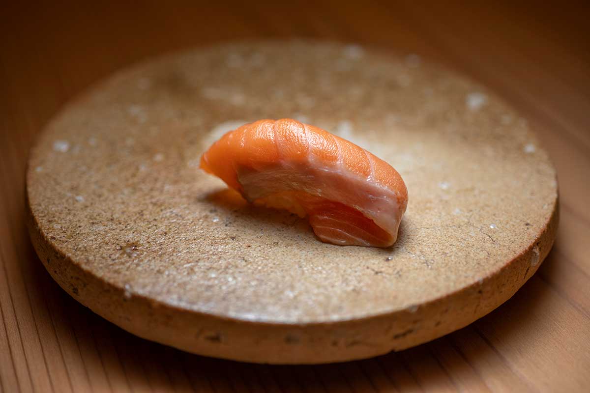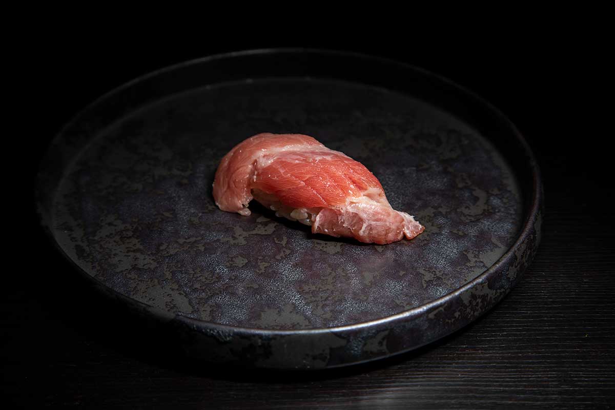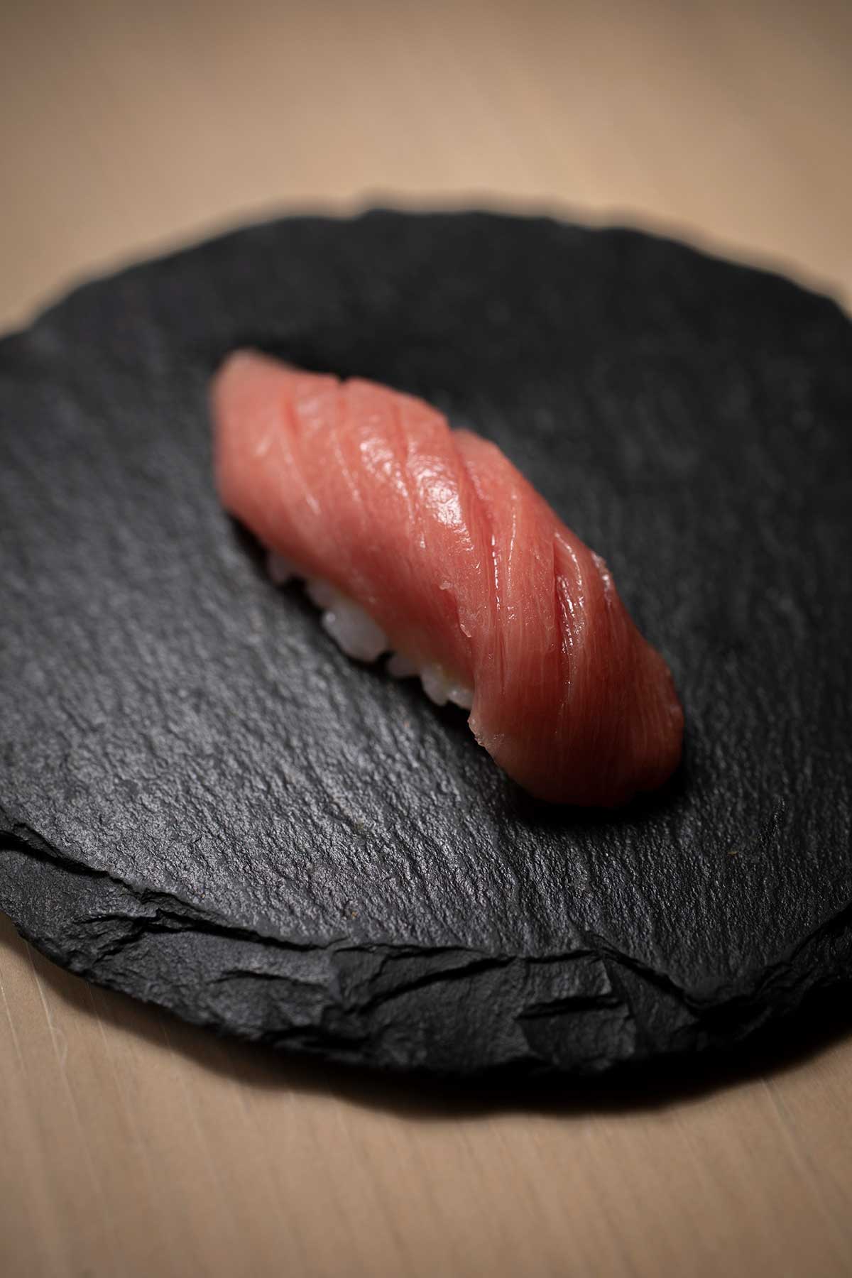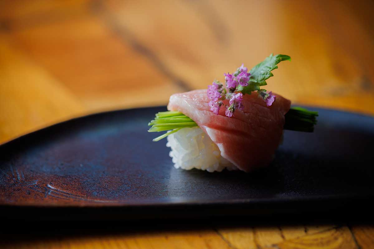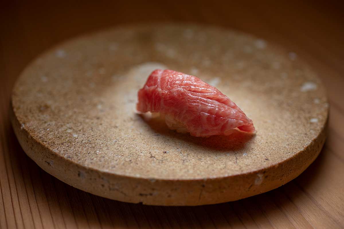 「ウチの推しはマグロ。県内一おいしいと思っています」。店主・前田恒平さんの言葉に力がこもる。しかしすぐさま「マグロにこだわっているお店は、ほかにもたくさんありますよね」と照れ笑いを浮かべ言葉をつなぐ。地元仙台で江戸前ずしの修業を積んだ前田さん。震災後に渡米しニューヨークで3年、すしを握った経歴を持つ。独立し、祖父の代から続く『鮨みずき』を現在の場所に移したのは2015年。以来3代目として、2代目の父と共に店に立つ。カウンター越しに見る茶屋札には〝大畑〞の記載。そして買い付け業者名『やま幸』とある。やま幸は、豊洲市場で日本一との呼び声高いマグロ仲卸専門店。全国の名店が取引先に名を連ね、職人たちも厚い信頼を寄せる。そのやま幸から、前田さんは兼ねてよりマグロを仕入れたいと熱望してきた。「マグロはすし屋の花形ですからね。最高にうまいマグロを味わってもらいたい、その味に感激してもらいたいと思うのは当たり前のことです」