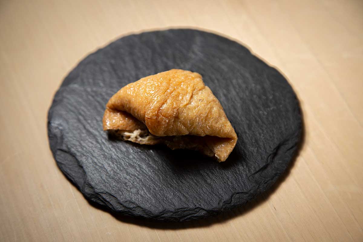 稲荷。ふっくらと炊き上げた色白の油揚げは、噛めばじゅうっとダシが滲む。