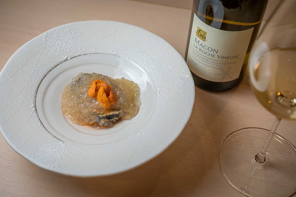 「黒鮑の柔らか煮」。「マコン・ラ・ロシュ・ヴィヌーズ・ブラン2018」(グラス・1200円)。