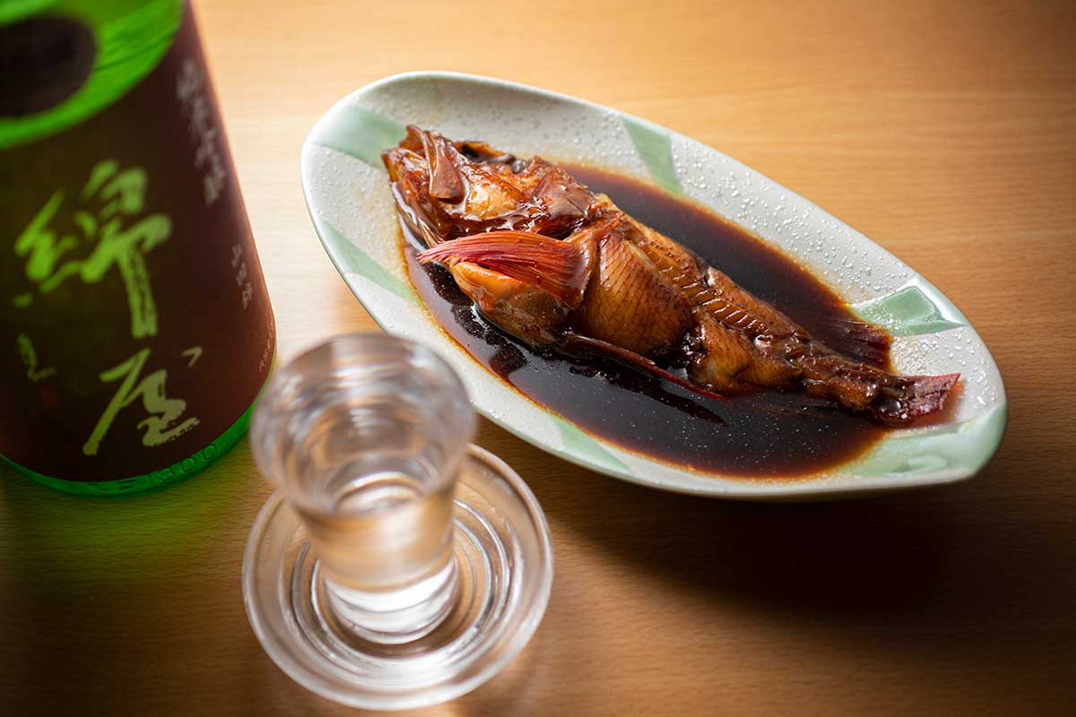 キンキの煮付け。「綿屋 純米吟醸 阿波山田錦」(グラス・600円)。
