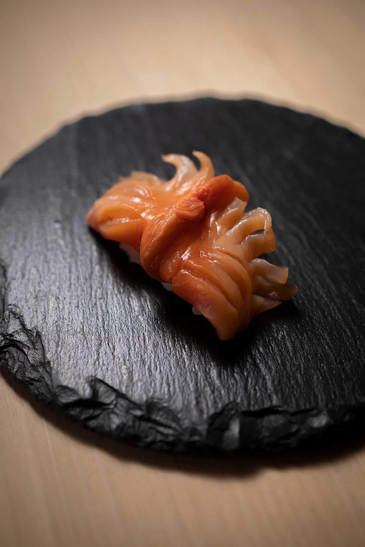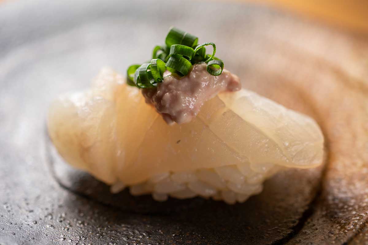 『司寿司』としての長年の装いを一新、もてなしのスタイルも一新。新たに『仙臺中江 みうら』が新生を果たしたのは、つい先日の9月20日のことだった。三浦貴久さんが先代『司寿司』の親方のもとを訪ねた時、彼はまだ15歳の少年だったという。生い立ちを尋ねると「長くなりますよ」と笑ったが、そんな複雑な来し方など想像できないくらい、三浦さんの物腰は柔らかく明るい。師弟として、時には親子のように仕事を共にして四半世紀、5年ほど前から三浦さんが軸となり先代が勇退したという。一新の理由を問えば、「ほら、ビルの外壁が新しくなるから、ちょうどいいかなあと思って」とこともなげに言うが、これからの自分のすしを確立するためには、この思い切った刷新が必要だったのだろう。『仙臺中江 みうら』の新たなかたちは、つまみが7、8品と握りや巻物が13貫ほど楽しめる1万1000円のおまかせコースと、つまみもすしもさらに増える1万6500円のおまかせコースが主軸。しかし、平日に限りつまみと握りや巻物併せて18〜20品に1時間40分の酒のペアリングが付いた1万1000円のおまかせコースがあるのが実に魅力的。いわばこの限定コースは「すしやのおまかせをもっと身近に気軽に楽しんでほしい」という『仙臺中江 みうら』の良心とも言うべき存在であり、その内容に大いに驚いてもらい、深みに嵌ってもらおうという楽しい楽しい罠だ。