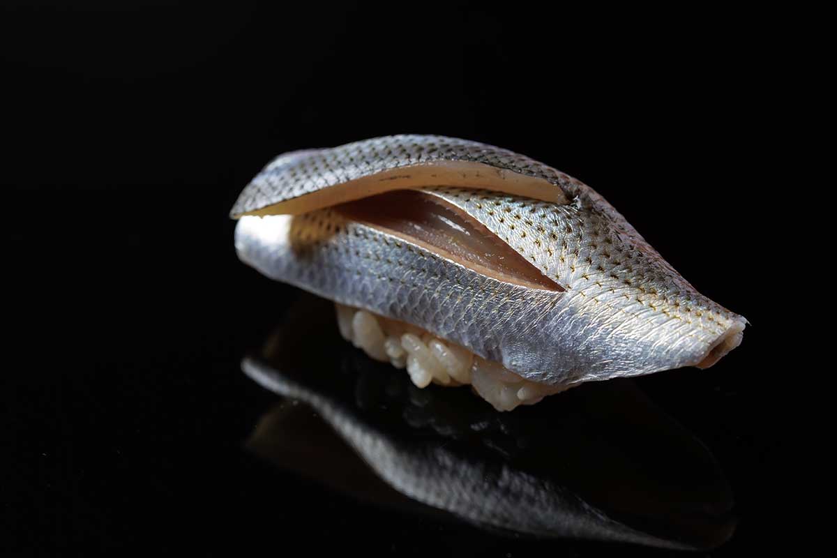 特注して作ってもらった本漆溜塗のつけ皿に握りが鏡のように映る。器もひとつひとつ吟味、その中で湧くインスピレーションが料理に顕現する。