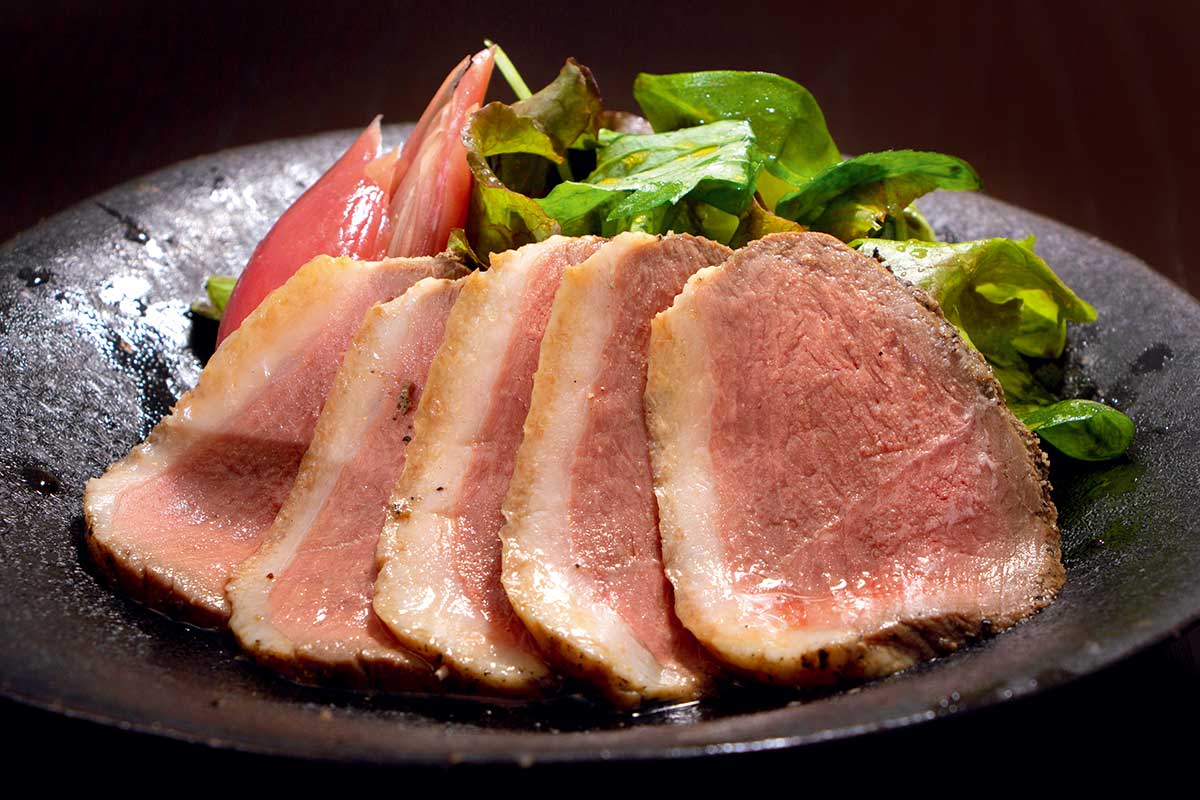 「鴨スモーク」1000円。マグレカナールというフォアグラ用の鴨の高級肉。鴨の赤身部は本来淡白なのだが、甘い脂がのっており、食感と香りが素晴らしい。自家製のドレッシングがかかっている。