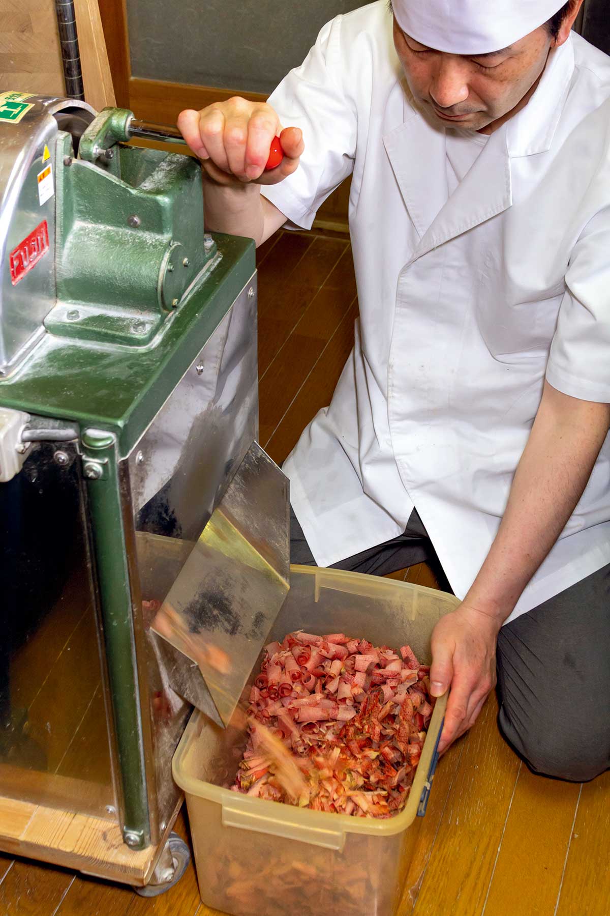 店主の小畑嘉則さん。かつお節を削るのも毎朝の仕事。機械を使い、一本のかつお節があっという間に削り節になる。作業場にはうまみさえ感じる上品な香りが充満し、本枯れ節のポテンシャルの高さを感じる。削りの厚さは厚削りと花がつおの中間くらいで、削った後に細かく手で砕く。
