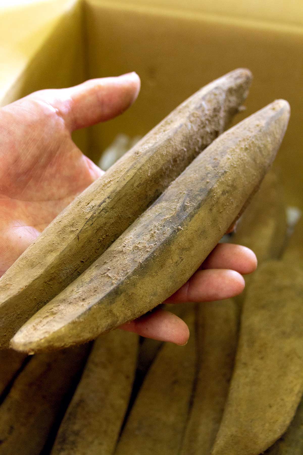 高級品である枕崎産の二年物本枯節。かつお節は五枚におろした身を、手間ひまかけて加工する。写真右が腹側、左が背中側でだしの出方も違う。