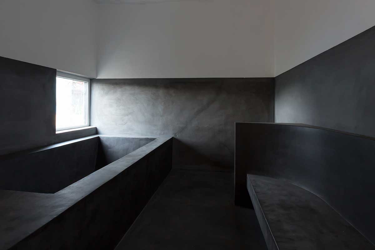黒で統一した浴室。窓の外には枯山水が広がる。