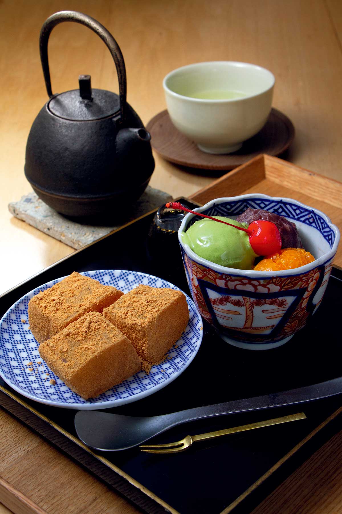 「甘味御膳(煎茶つき)」980円。店のもうひとつの顔が甘味で、これはわらびもちとあんみつのセット。甘さを控えた自家製のわらびもちには、国産大豆の深煎りきな粉がたっぷりかかっている。あんみつは昔ながらのビジュアルのもので、自家製の粒あん、抹茶アイス、寒天、豆に果物。沖縄産黒糖の黒蜜をかけていただく。