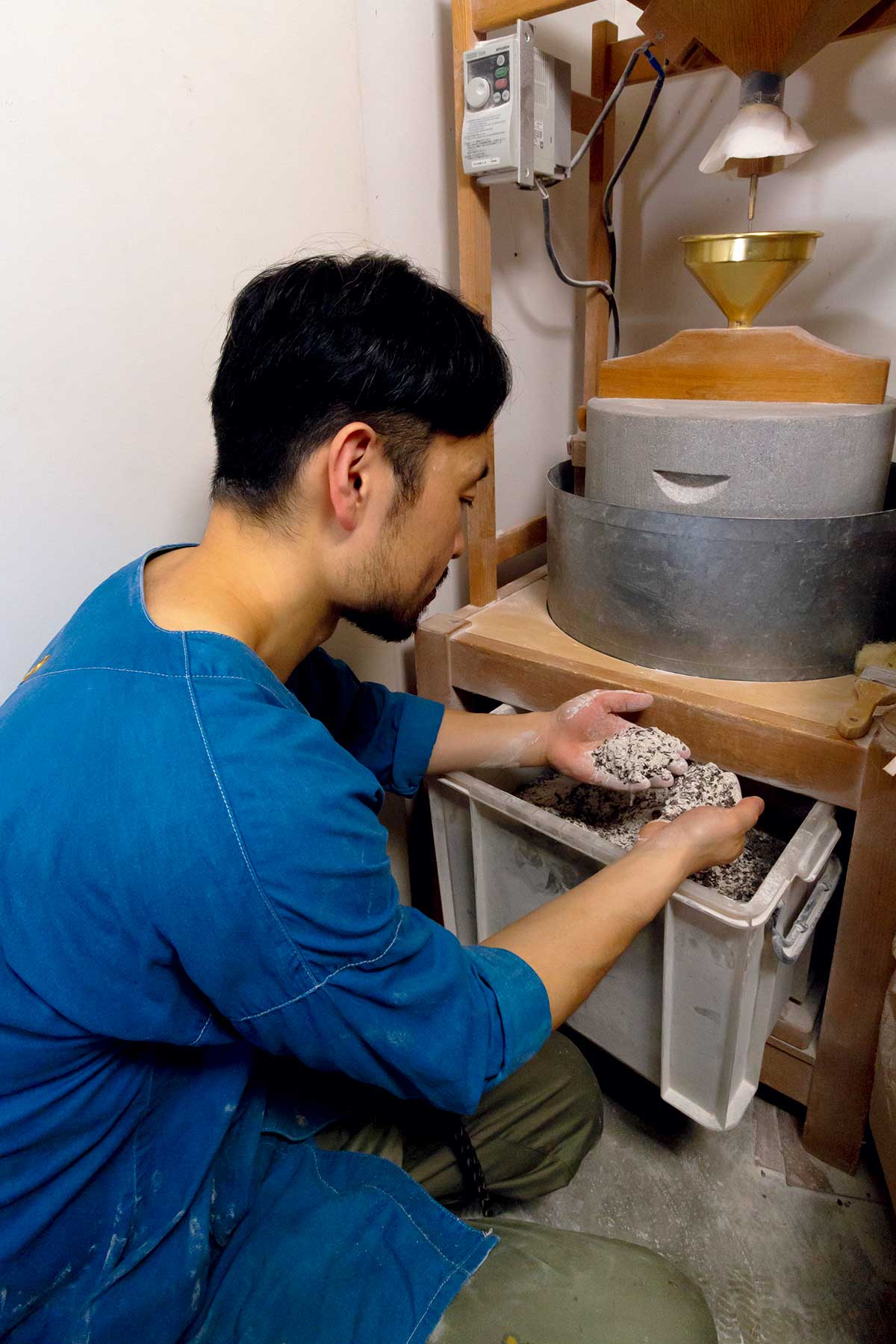1階作業場の一角に電動石臼が置いてある。製粉は殻ごとの一回挽き。出てきた粉には殻も混じっており、これをふるいにかけて必要な部分の粉だけを取り出す。