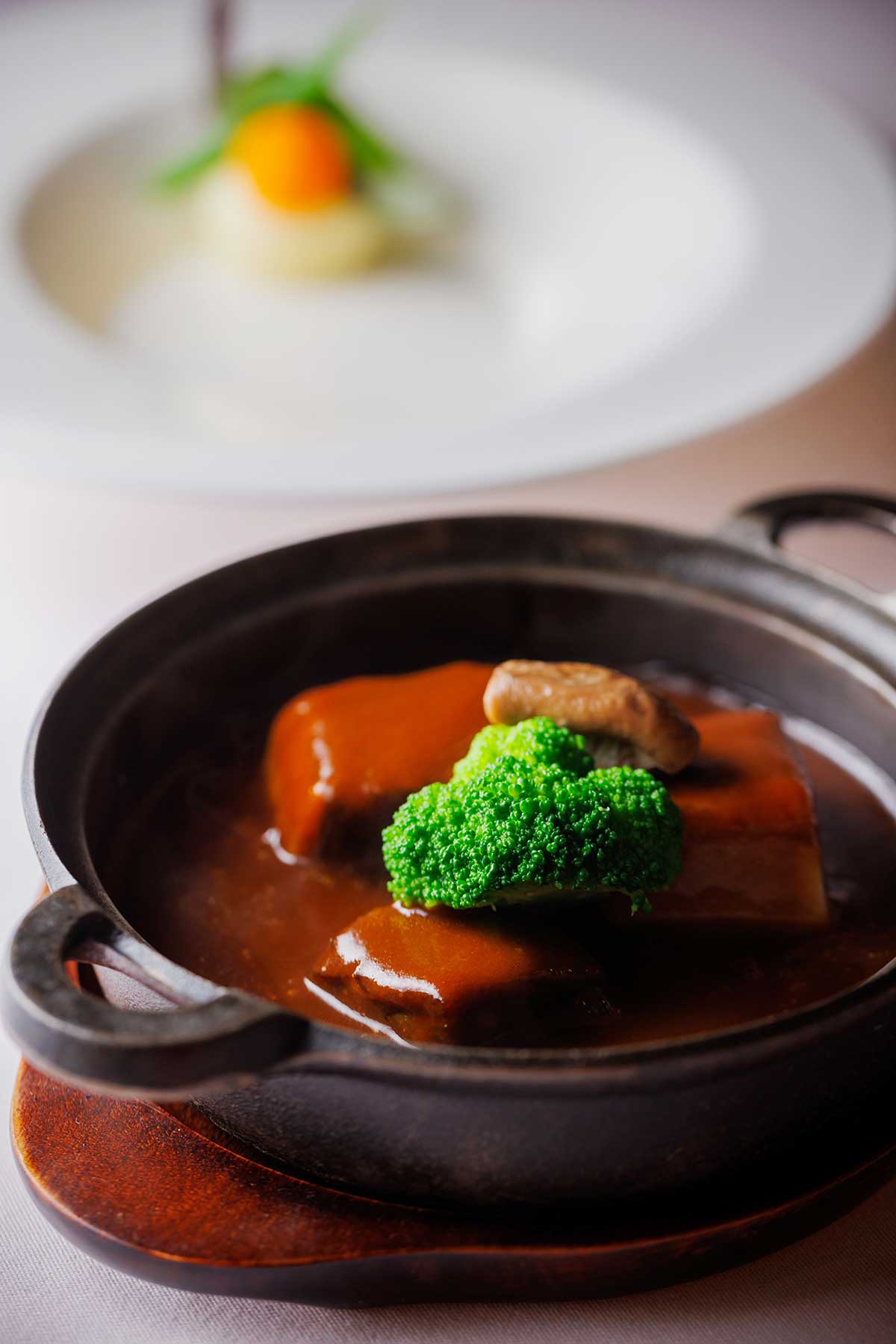 ソースと肉を合わせ、特注した南部鉄器のキャセロールでサーブ。