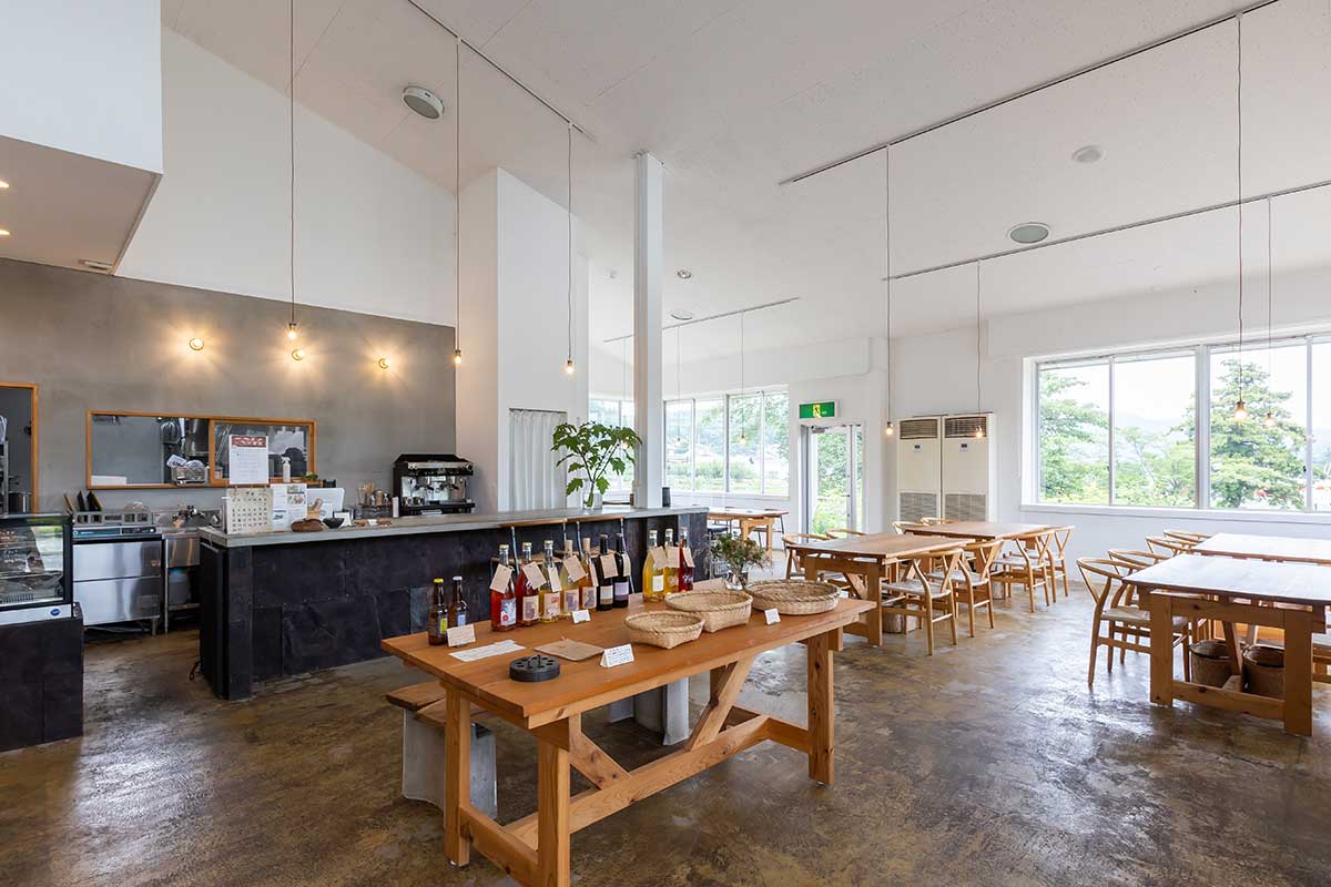 高い天井、大きな窓から望む川崎の風景がのどかで心地よい。フロアには川崎町産のおいしいもの、うつくしいものが並ぶ。佐藤さんの祖父が使っていた牛舎に葺かれていたトタンなども店の造作に活かして。